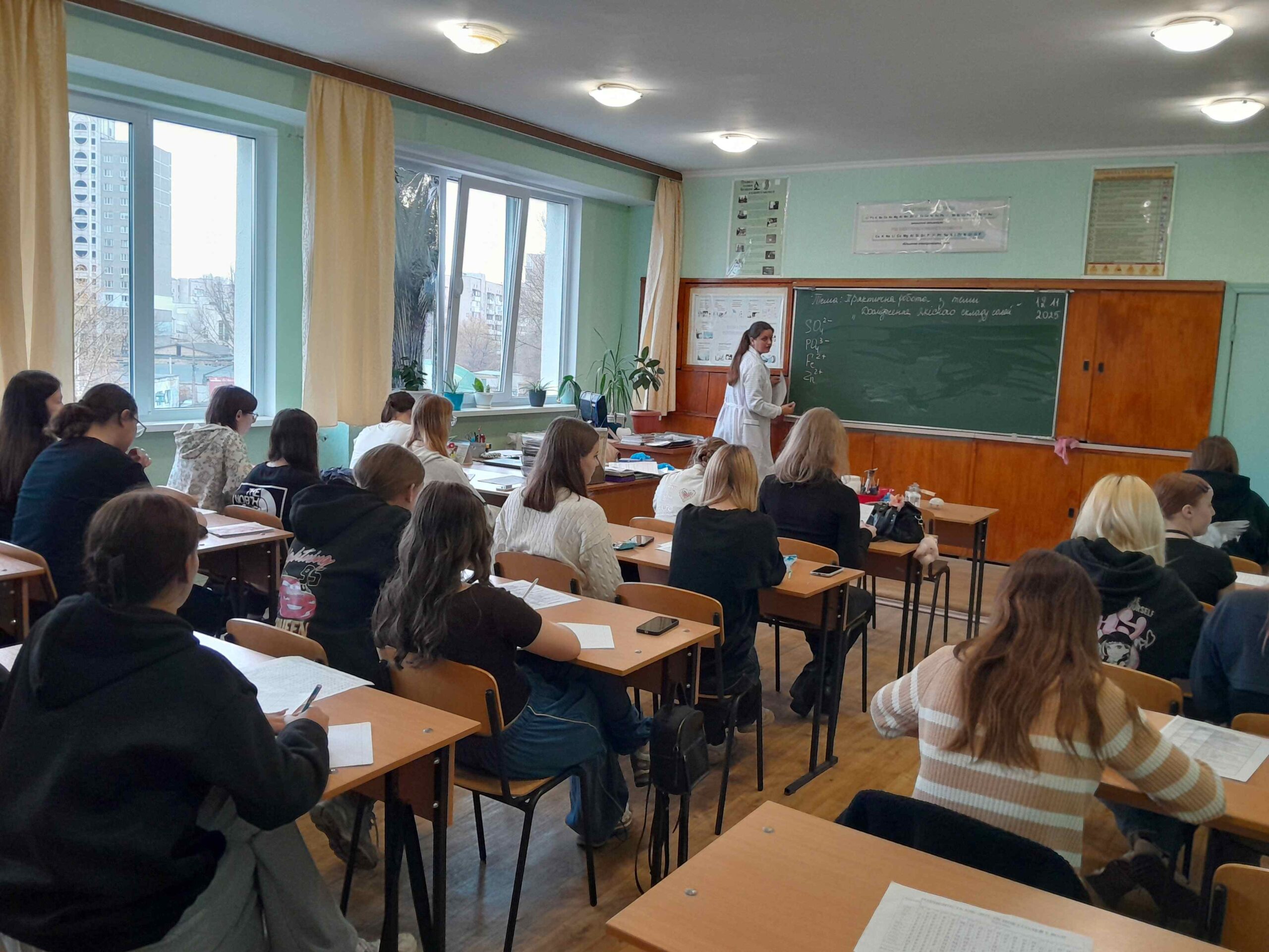 Протягом уроку викладач виконала та продемонструвала якісні реакції для визначення катіонів та аніонів у певних солях, а здобувачі освіти заповнювали таблицю спостережень після кожного досліду та записували молекулярні та іонні рівняння реакцій, формулювали висновки.