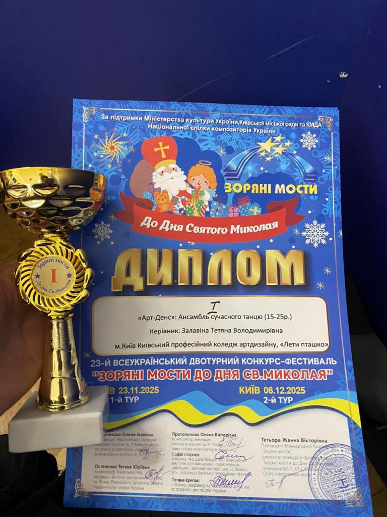 Наш  ансамбль сучасного танцю «Арт-Денс» отримав диплом у першому турі за І місце у 23-му Всеукраїнському двотуровому конкурсі-фестивалі «Зоряні мости до Дня Святого Миколая». Цей конкурс-фестиваль був організований за підтримки Міністерства культури України, Київської міської ради та КМДА, Національної спілки композиторів України. Наші чарівні дівчатка та мужні хлопці виконали танцювальну композицію «Лети пташко» під керівництвом Тетяни Залавіної. Цей патріотичний, чуйний та водночас сильний, ритмічний танець вразив журі конкурсу і наш ансамбль отримав високі оцінки. Вітаємо «Арт-Денс» та Тетяну Залавіну з перемогою у першому турі та бажаємо перемоги у фіналі!