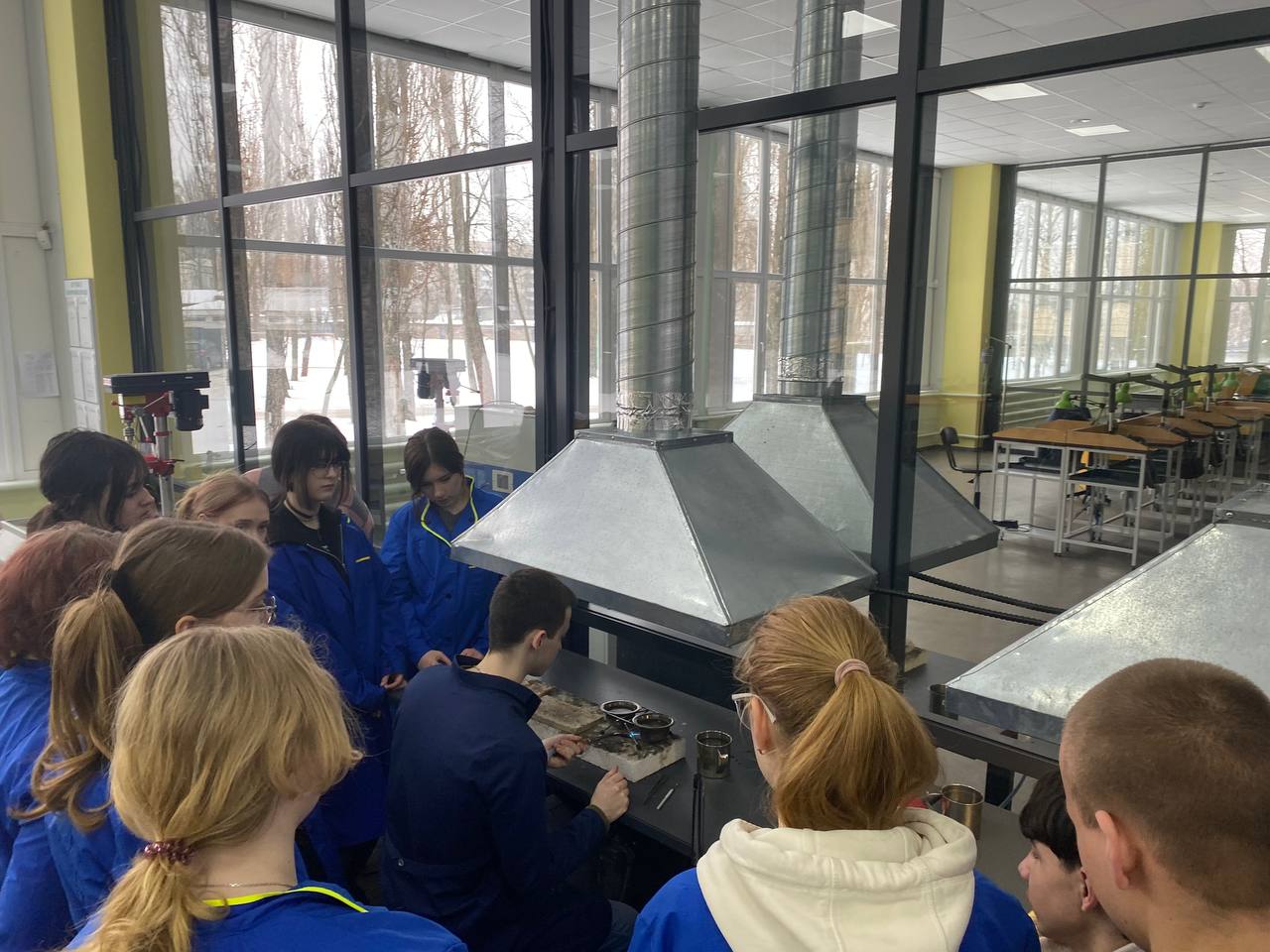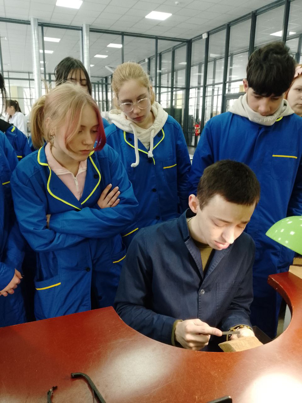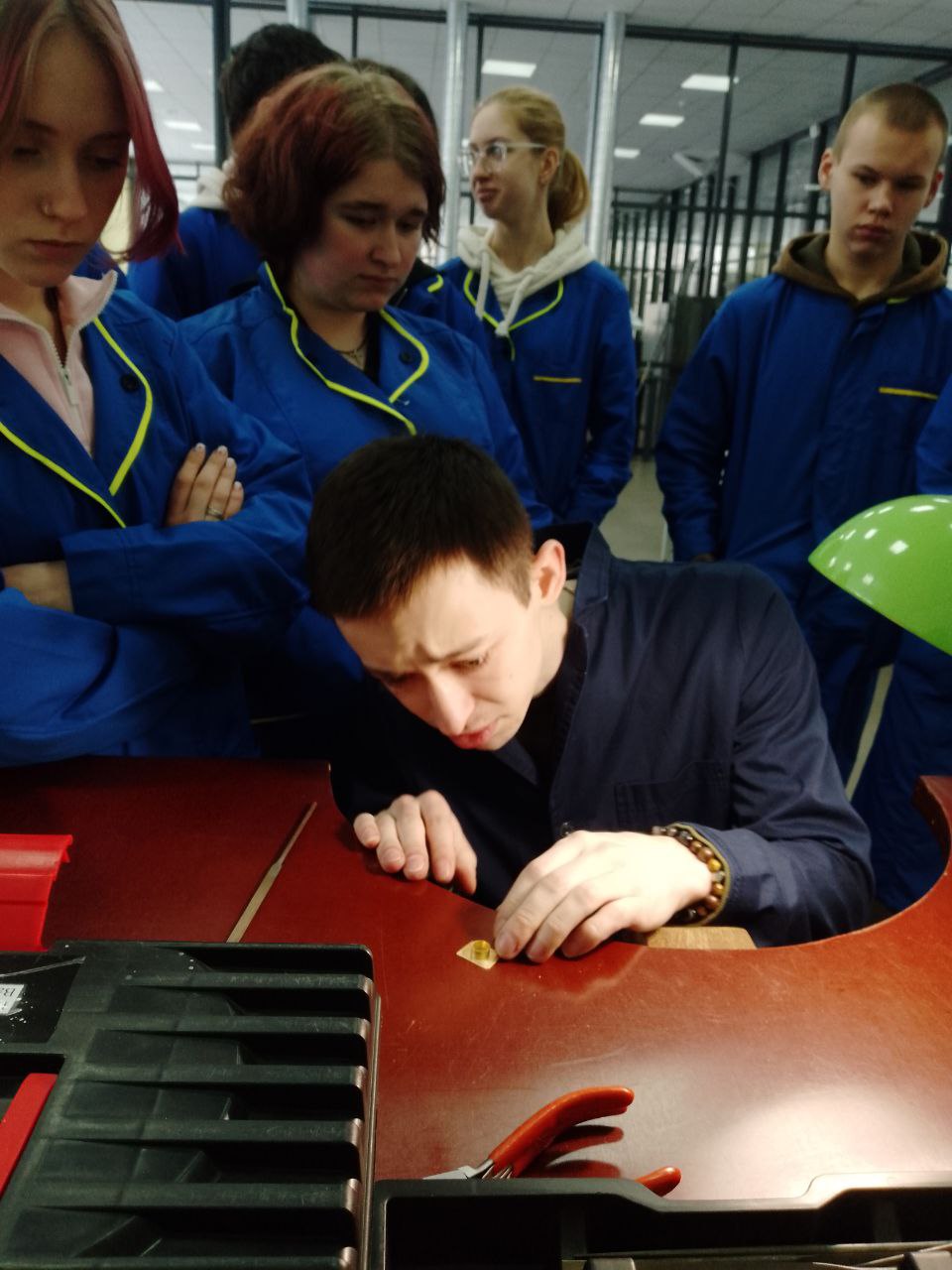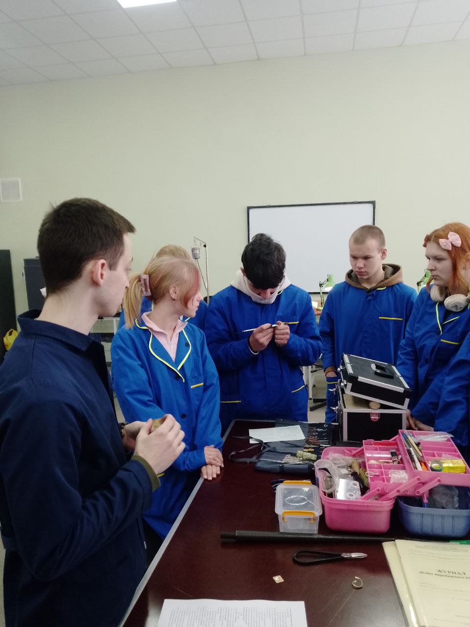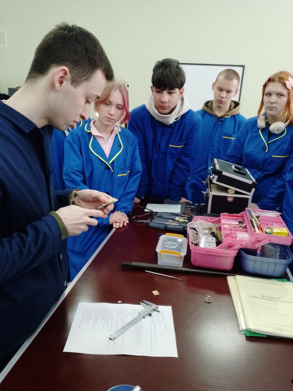 Під керівництвом досвідченого майстра виробничого навчання студенти пройшли шлях від металевої заготовки до готового елемента прикраси. Майстер наголосив на етапі виготовлення глухого каста, де створюється внутрішня опора, на якій буде лежати камінь та звернув увагу на контроль висоти стінок каста, щоб метал закривав лише необхідну частину кабошона, не перекриваючи його красу. Під час уроку особлива увага приділялася роботі з латуню.