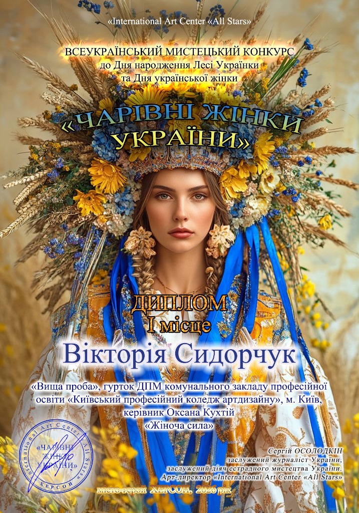 Мистецтво завжди було дзеркалом душі народу, а сьогодні воно стало нашою найпотужнішою зброєю та ліками. Нещодавно відбувся Всеукраїнський мистецький конкурс до Дня народження Лесі Українки та Дня української жінки «Чарівні жінки України» (Херсон, 2026), який об’єднав таланти з усіх куточків країни. Радіємо та пишаємося, адже перше місце виборола наша студентка Вікторія Сидорчук, яка навчається на ІІІ курсі за професією «Ювелір (ювелір-модельєр)».
