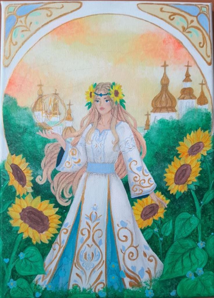 Центральною фігурою полотна є молода дівчина у білосніжній сукні – символі чистоти та нового життя. Її голову прикрашає вінок із соняхів, які наче ввібрали в себе все тепло українського сонця. Героїня стоїть посеред соняшникового поля, що асоціюється з рідною землею та її плодючістю.